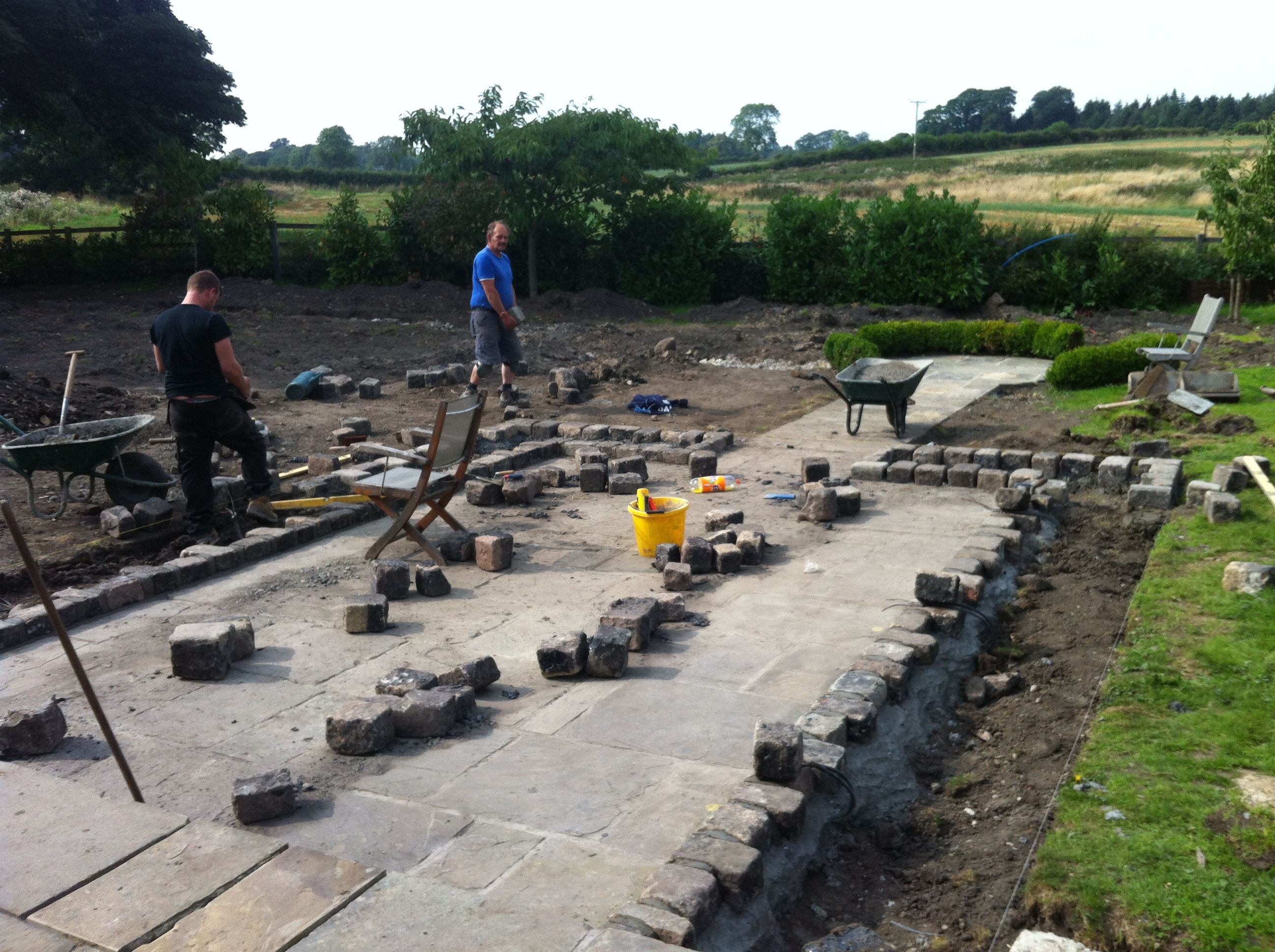 We started by lifted the York stone, filled in both ponds (after moving their inhabitants) and set some strong lines down the garden to take your eyes into the beautiful corn fields beyond the fence line. With a large digger we moved half of the laurel hedge and filled the gaps with Photinia to give a mixed backdrop.